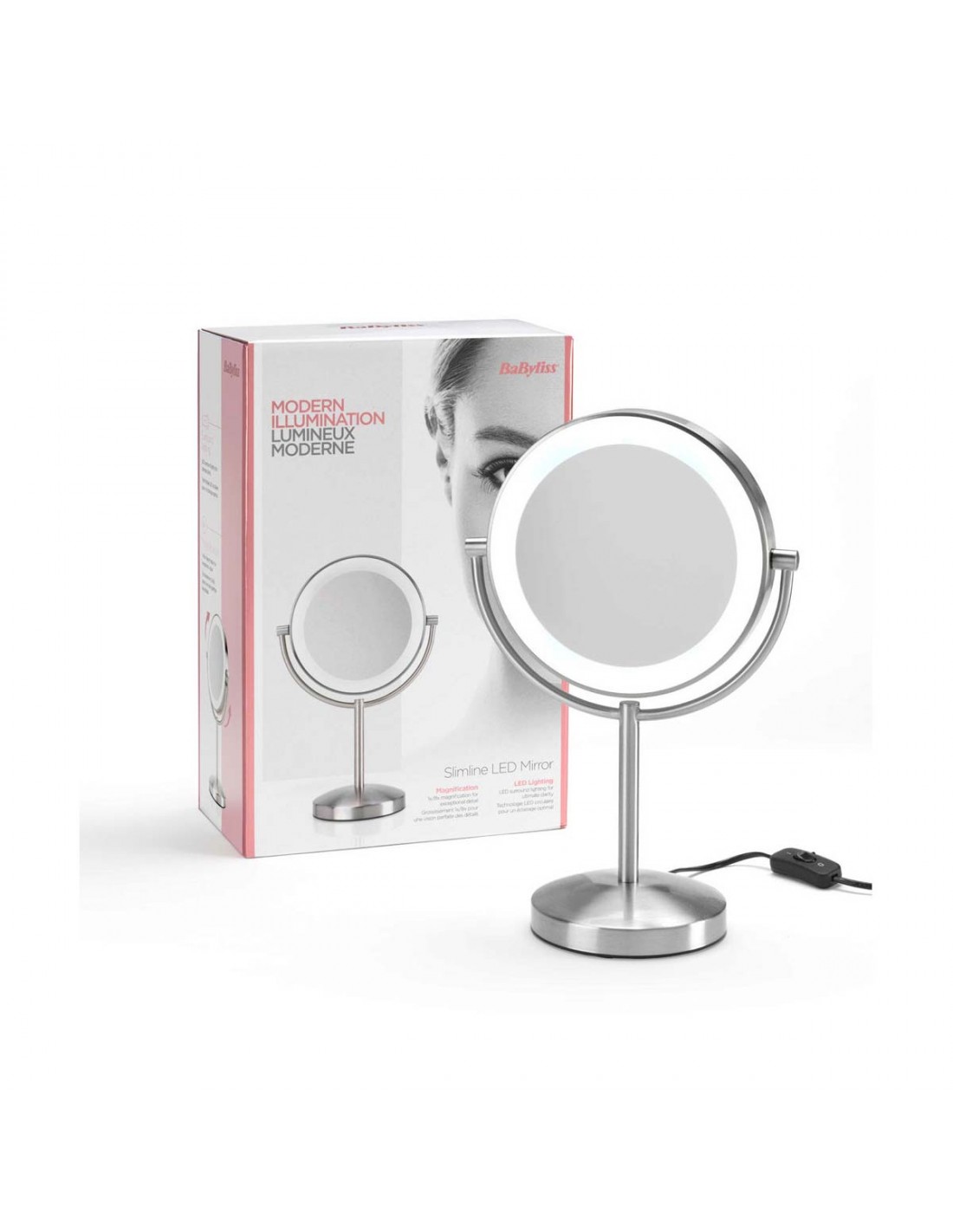 Babyliss Ultra Slim Line Led Mirror - double sided mirror. Satin mirror with LED lighting. Magnification 1x-8x. Long lasting LED light. Diameter 21,5 cm